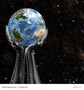 Planet Earth held in cosmic star space by invisible, translucent hands.