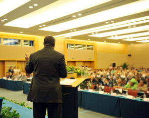 Business man is making a speech in front of a big audience at a conference hall.